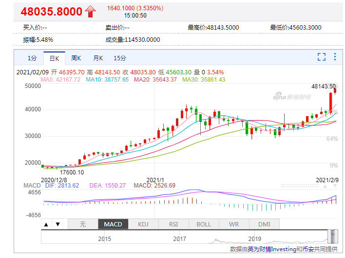 经过一个月的涨涨跌跌之后,比特币现再度收回四万美元关口,比特币于8日收盘爆涨19.41%。周二亚市盘初延续涨势,截至目前,比特币盘中突破48000美元/枚,再创历史新高。