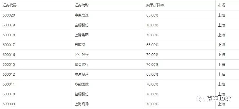 甭管你是多大腕儿,央企国企,一律7折,资质稍微差点儿的中小盘股,像图中的日照港、中原高速,只能给65折。抵押物除了现金和股票,还可以用ETF等场内基金,折算率要高一点,比如下图这几个: