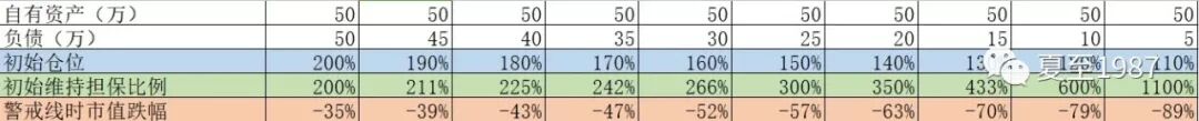 我们以自有资产(净资产)50万为基础,对不同的融资额(5万-50万),分别给出了对应的初始仓位、初始维持担保比例、被平仓的市值跌幅等数据,制成图表后更加一目了然: