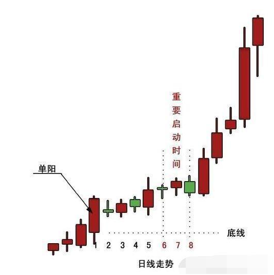 一根大阳线出现之后,其后6-7根K线横向盘整,并且所有的低价都没有击穿该阳线的最低价,这就是“单阳不破”