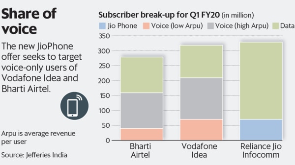 该消息使Reliance Jio宣布大幅增加其4G功能手机的补贴,该消息使该公司的股票在过去两个交易日中下跌了16%,并使Bharti Airtel Ltd的股价下跌了6%。现在,JioPhones的预付费用为699卢比,而之前的计划为1,095卢比。