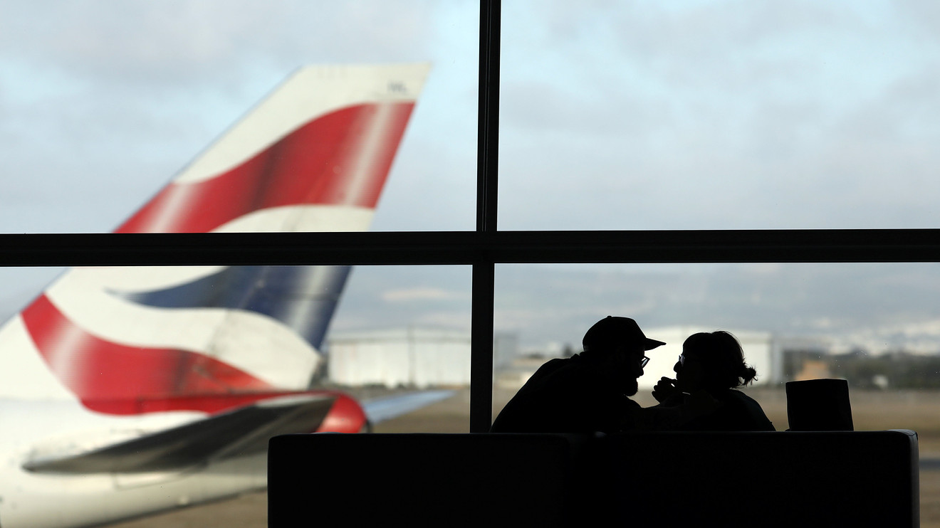 一架英国航空公司的波音747客机准备起飞。英航的所有者报告客运量增加。