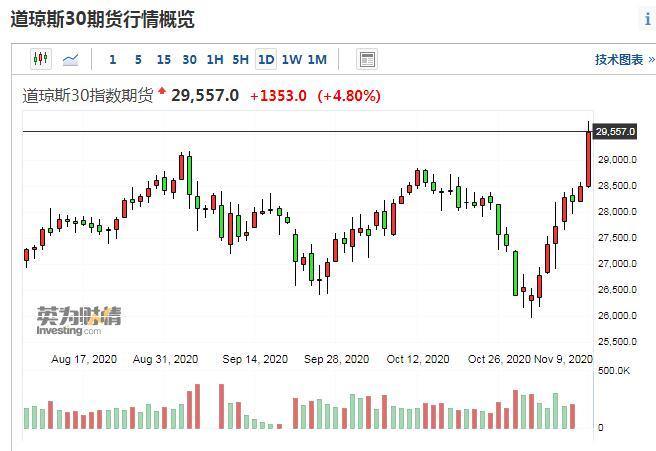 美股股指期货大涨 道指期货涨幅扩大至5%