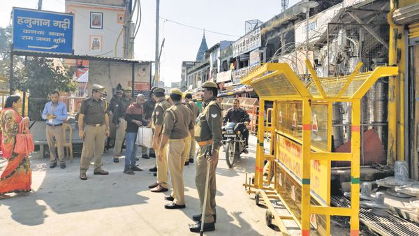 在星期六的判决后,有争议的地点变成了堡垒。 Ram Janmabhoomi距离阿约提亚(Ayodhya)的一个枢纽点Hanuman Garhi约3公里。数十名州警察人员在入口处打扰朝圣者。
