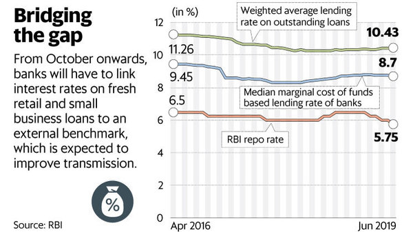 如相鄰的圖表所示,現有的基於貸款利率的資金邊際成本(MCLR)未能通過利率下降給借款人的全部利益。