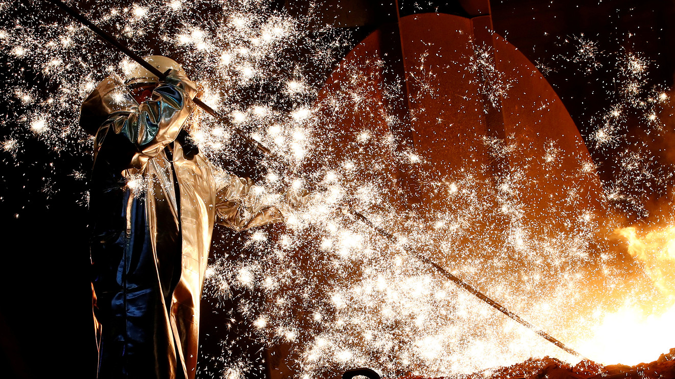德國工業企業集團蒂森克虜伯公司(ThyssenKrupp AG)的一名鋼鐵工人站在德國最大的杜伊斯堡鋼鐵廠的高爐中生鐵的火花。
